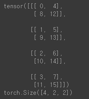 i는 torch.arange(16)으로 0 ~ 15를 차례대로 value로 같은 텐서를 만든다. reshape(2,2,4)로 3차원으로 만드는데 0차원이 2개이고 2행 4열짜리 텐서를 만든다. transpose(1,2)로 (2,2,4)에서 인덱스로 봤을 때 인덱스[1]인 2와 인덱스[2]인 4를 바꾼 텐서를 만드는 것 4행 2열짜리 2차원 텐서를 만든다고 생각한다. 아닌가.. permute()도 역시 (2,0,1)을 각각 바꿔주는 역할을 하는 듯하다.