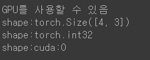 해석: 1. tensor라는 변수에 0~1사이 값을 랜덤으로 가지는 3행 4열짜리 텐서를 만든다. 2. 텐서의 형태, 타입, 연산이 되는곳을 찍어본다. 3. tensor를 4행 3열로 바꾸고 정수타입으로 바꾼다. 4. if문을 통해 GPU사용 여부를 확인한다. 5. if가 True일 경우 : console에 GPU를 사용할 수 있음이라는 메세지를 보내고 tensor를 cuda로 이동시킨다 6. 그 후 텐서의 형태, 타입, 연산이되는곳을 찍어본다.